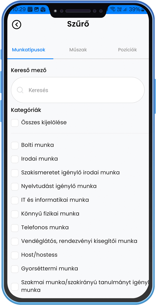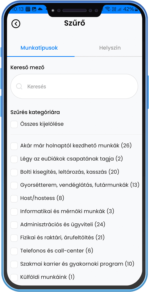 Visszatérve a főoldalra a szűrő ikon mellett az „összes” gombot találod, mellette pedig a különböző munkakategóriákat, amelyekkel a szűrések során is találkozhattál. Balra tudod csúsztatni a menüt. Az összes gombbal törlöd a korábban megadott szűrési paramétereket.