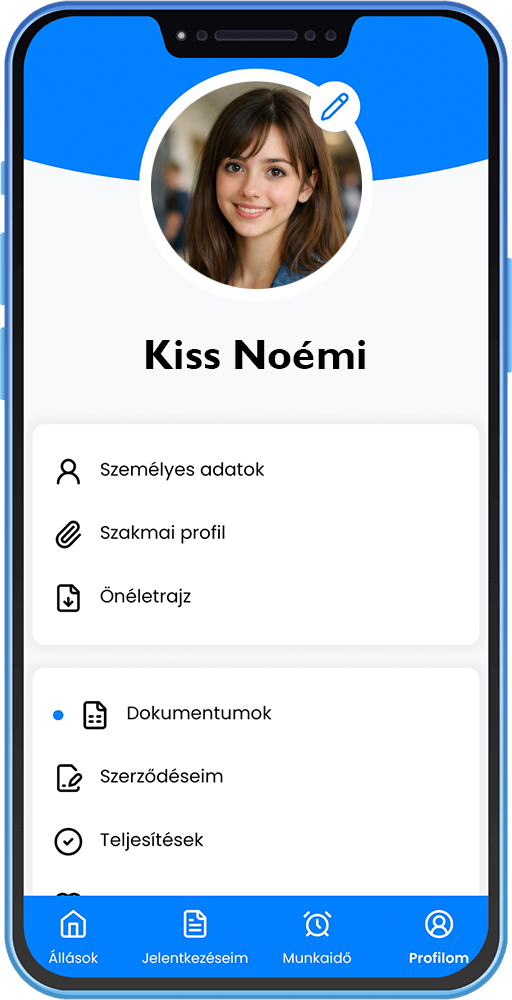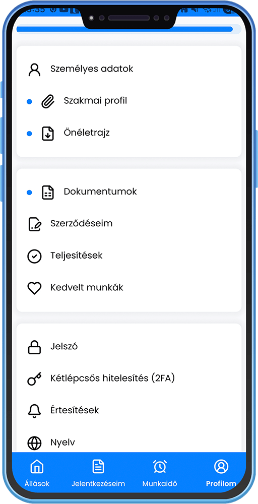 A Profilom menüben adhatod meg és frissítheted a személyes, tanulmányi és szakmai adataidat. Minél részletesebb a profilod, annál relevánsabb ajánlatokat és jobb CV-t kapsz.