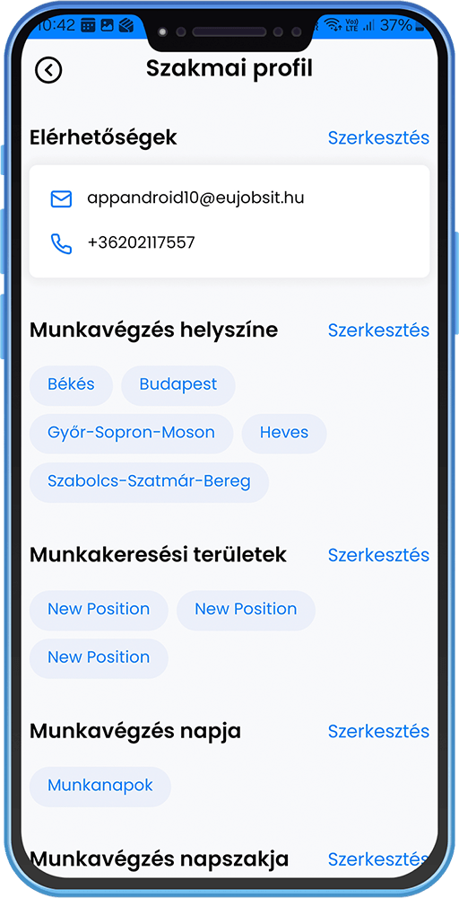 A szakmai profil adatainak kitöltésére is érdemes pár percet szánni. Minél részletesebben adod meg ezeket az adatokat, annál relevánsabb munkaajánlatokkal tudunk megtalálni.
