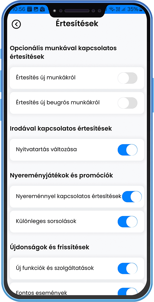 Az Értesítések menüben beállíthatod, hogy miről szeretnél és miről nem szeretnél értesítést kapni az appban.