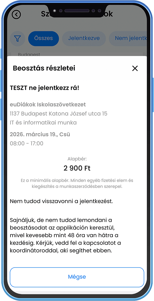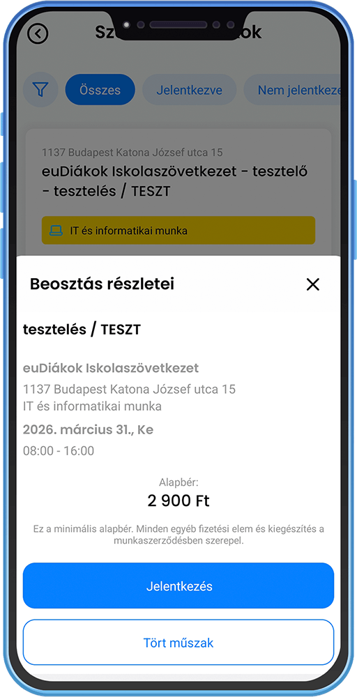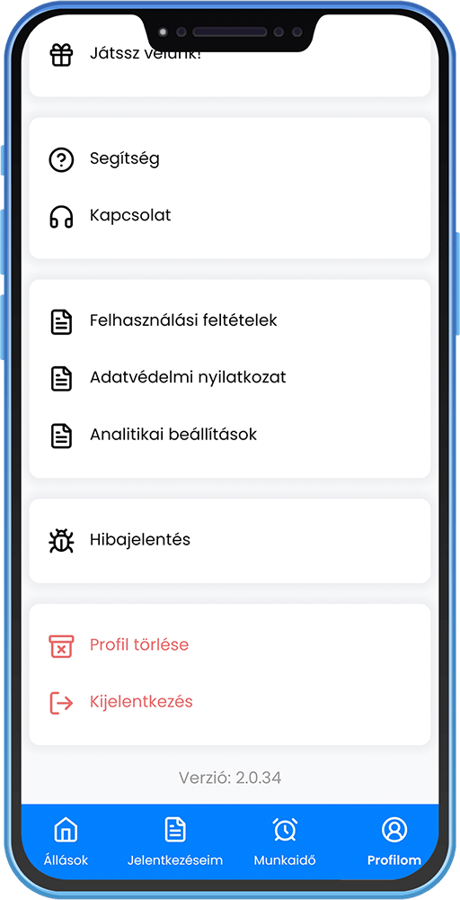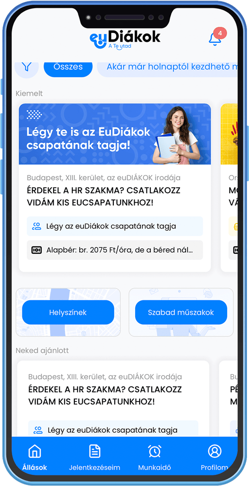 Fontos, hogy hirdetésekre, illetve szabad műszakokra csak úgy tudsz jelentkezni, ha megadtad a telefonszámodat. Előbbiekre meg csak akkor, ha diákmatricád érvényes. Mindkettőt a profilom menüben tudod beállítani, megadni.