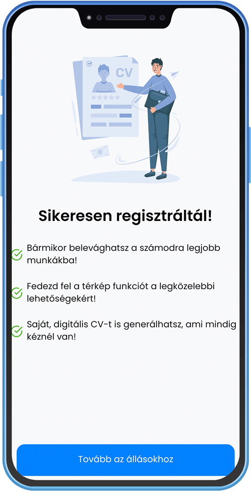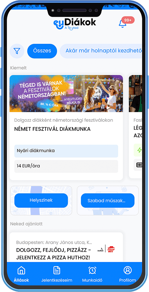 A főképernyőn gyorsan átláthatod az új ajánlatokat, szűrhetsz a neked megfelelő lehetőségekre, és elérheted a legfontosabb munkakeresési funkciókat.