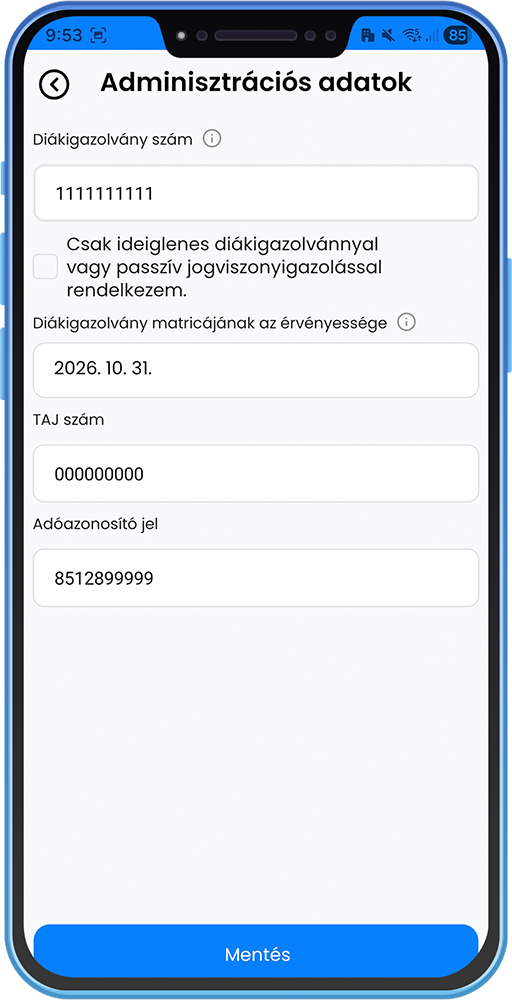 A személyes adatokon belül ha az adminisztrációs adatokra kattintasz, akkor itt tudod frissíteni a diákigazolványod matricájának az érvényességét. Amennyiben új diákigazolványt kaptál, akkor itt mindenképp írd át a diákigazolványod első oldalán a jobb felső sarokban szereplő számot!
