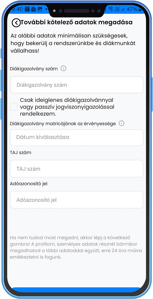 Ha nem tudod a regisztrációkor megadni ezeket az adatokat, akkor nyugodtan lépj tovább, a profilodban bármikor pótolhatod, erre figyelmeztetünk is üzenetekben. Fontos, hogy amíg ezeket az adatokat nem adod meg, addig nem látjuk adataidat, jelentkezéseidet a belsős rendszerünkben.
