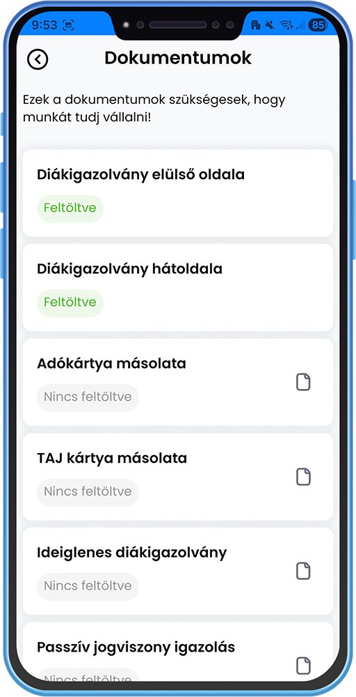 A dokumentumok menü egyik pontja sem kötelező elem (kivéve a külföldiek esetén). Ezek nélkül alapesetben tudsz már dolgozni. Ha valami probléma lenne a megadott adataiddal (Diákigazolványszám, adóazonosító, stb…) akkor a kollégáink keresni fognak, és az a legegyszerűbb ha itt töltöd majd fel a dokumentumaidat.