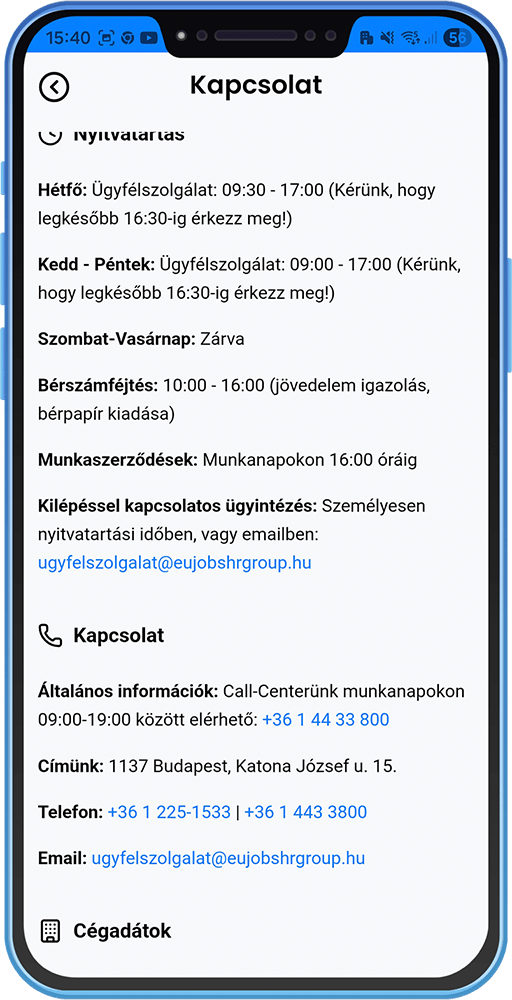 A Kapcsolat menüben találod a kollégák, az irodák és a cég elérhetőségeit.