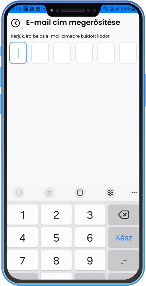 E-mail címed megadását követően egy 6 jegyű kódot kapsz emailben. Ezt beírod, majd meg kell adnod egy jelszót kétszer.
