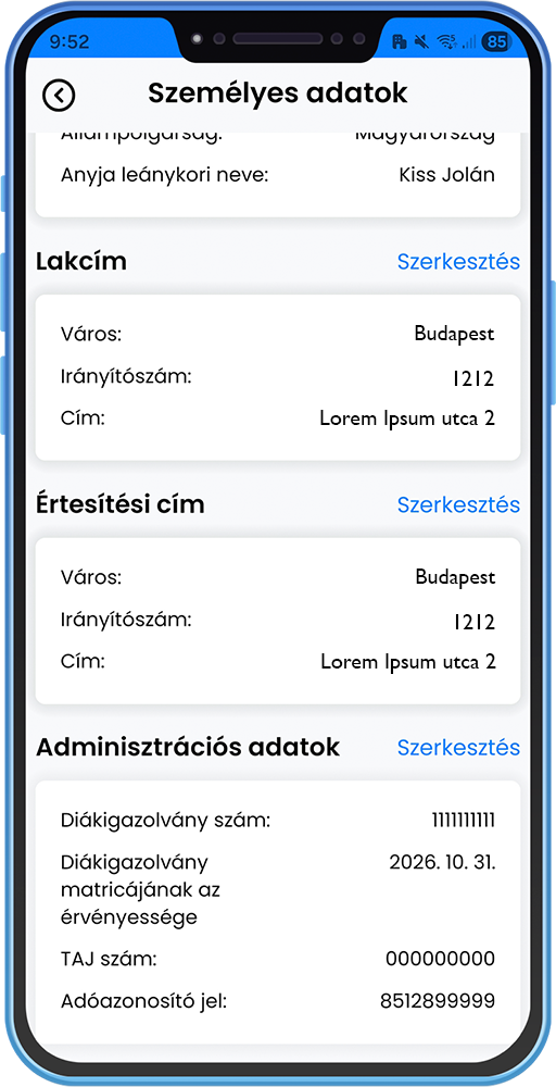 A személyes adatokon belül tudod teljes körűen megadni, esetleg módosítani az adataidat.
