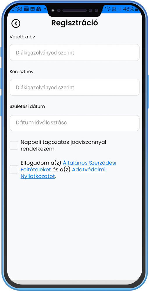 Ezt követően a nevedet írd be úgy, ahogy a diákigazolványodon szerepel, majd a születési dátumodat. Be kell pipálnod, hogy nappali tagozatos diák vagy majd kiválasztani, hogy aktív vagy passzív a hallgatói jogviszonyod. Diákszövetkezetben csak 15. életévét betöltött nappali tagozatos aktív vagy 25 éves korig nappali tagozatos passzív jogviszonnyal rendelkező diák dolgozhat. Ha estis vagy levelezős diák vagy, esetleg nem vagy már diák akkor nem érdemes folytatnod a regisztrációt.